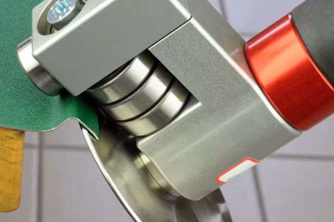 Placez le Disc-O-Bender à l'endroit du pliage souhaité, positionnez les rouleaux avec précision sur le bord et guidez l'outil uniformément le long du bord de la tôle. Le système de rouleaux précis assure un guidage stable, permettant de réaliser des pliages contrôlés , même sur des tôles longues ou des profils complexes. La goupille de verrouillage permet de faire pivoter et de fixer rapidement et solidement le rouleau d'arrêt pour effectuer différentes opérations de pliage.